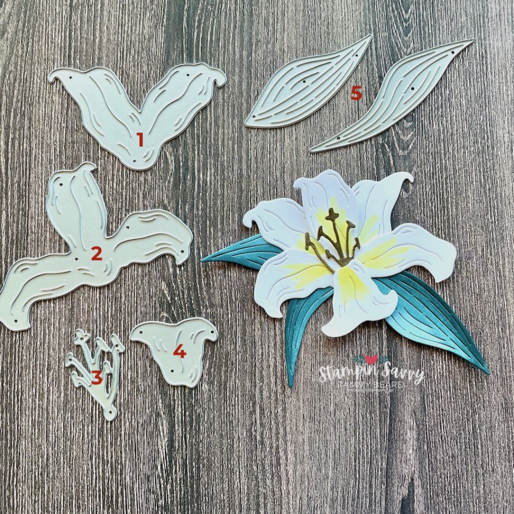 - Die-cut one flower and both leaves with EASTER LILIES Dies (see pieces in photo above)