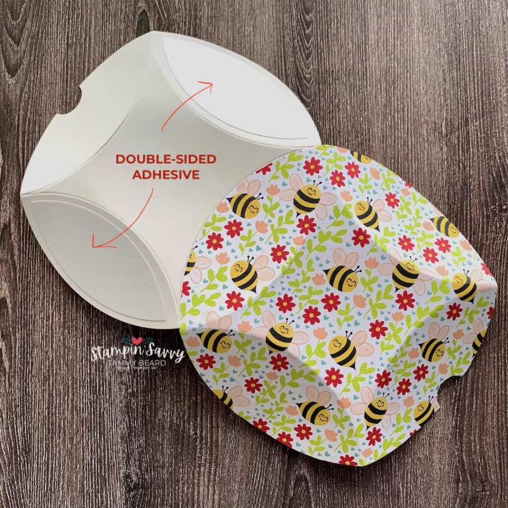 You don’t need to unfold yours, but this shows (photo above) what the box looks like after the designer paper is trimmed (and before assembly)… BEE-utiful!!